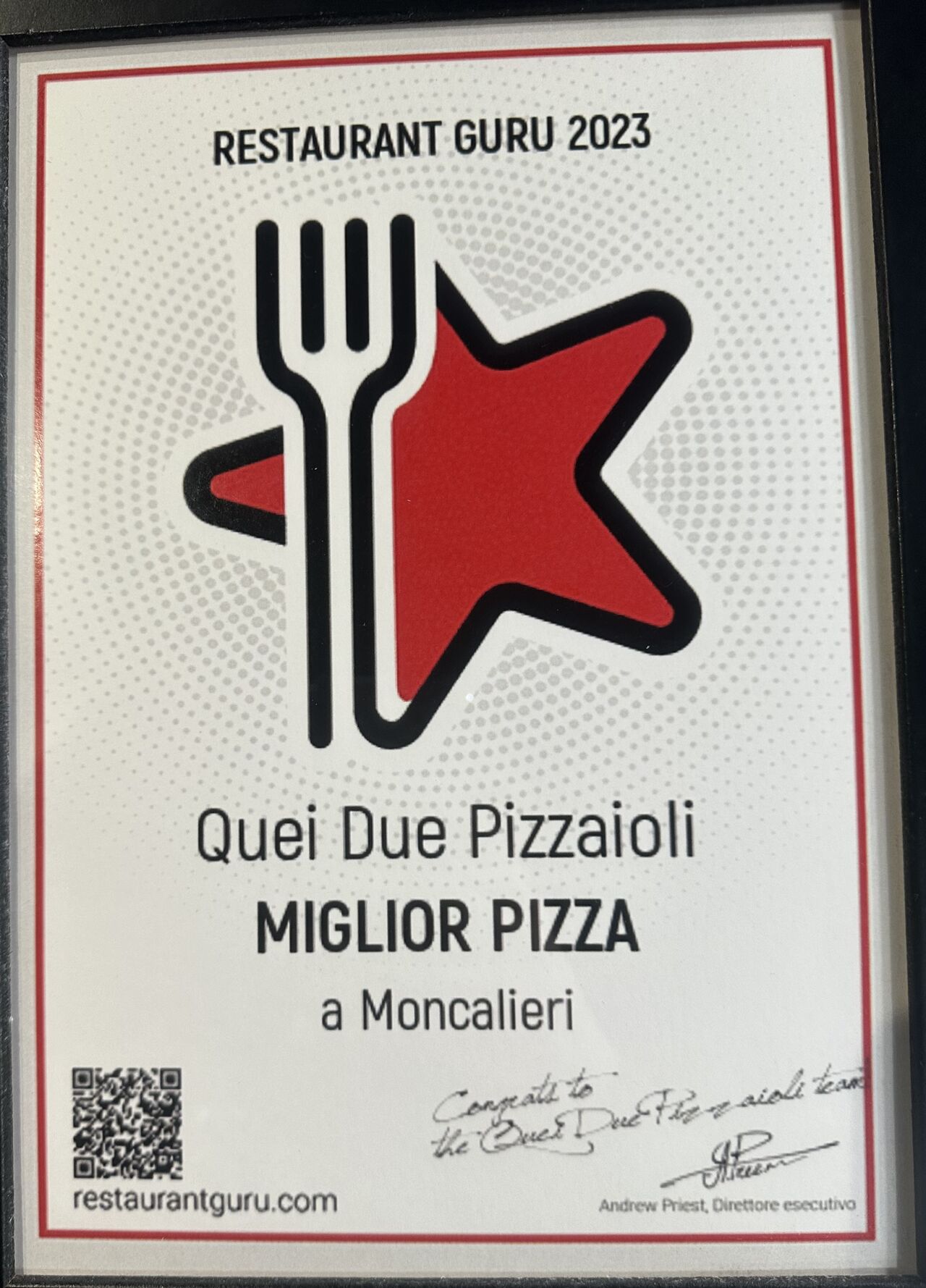 Siamo orgogliosi e onorati di comunicarvi che la nostra pizzeria si è aggiudicata il titolo di miglior pizza di Moncalieri 2023 su Restaurant Guru grazie alle vostre preziosissime recensioni